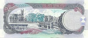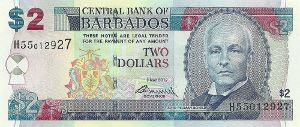 The old Barbados 2 Dollar note was first issued in 1973 and depicts John Redman Bovell and Trafalgar Square. A wave design type was issued in 2013. The note measures 150mm x 65mm.