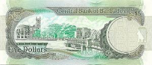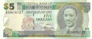 The old Barbados 5 Dollar note was first issued in 1973 and depicts Sir Frank Worrell and Trafalgar Square. A wave design type was issued in 2013. The note measures 150mm x 65mm.