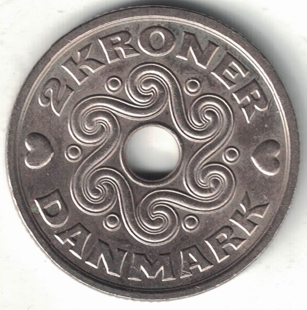 The current Danish 2 Kroner coin was first issued in 1992 and has a centre hole with crowns surrounding. The coin weighs 5.9g has a diameter of 24.5mm and is made of copper nickel.
