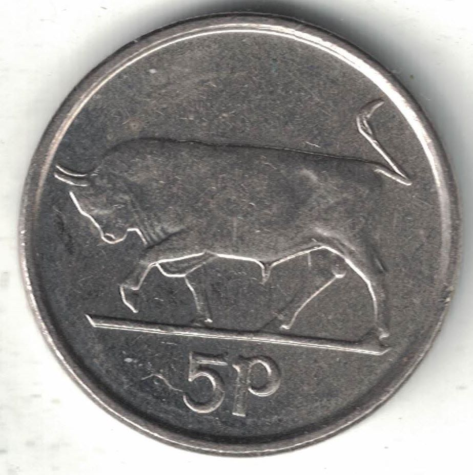 The old Irish 5 pence coin was issued from 1969 to 2000 and a depicts a bull and harp. There size was reduced in 1992. The coin weighs 5.66g or 3.25g has a diameter of 23.6mm or 18.5mm and is made of copper nickel.